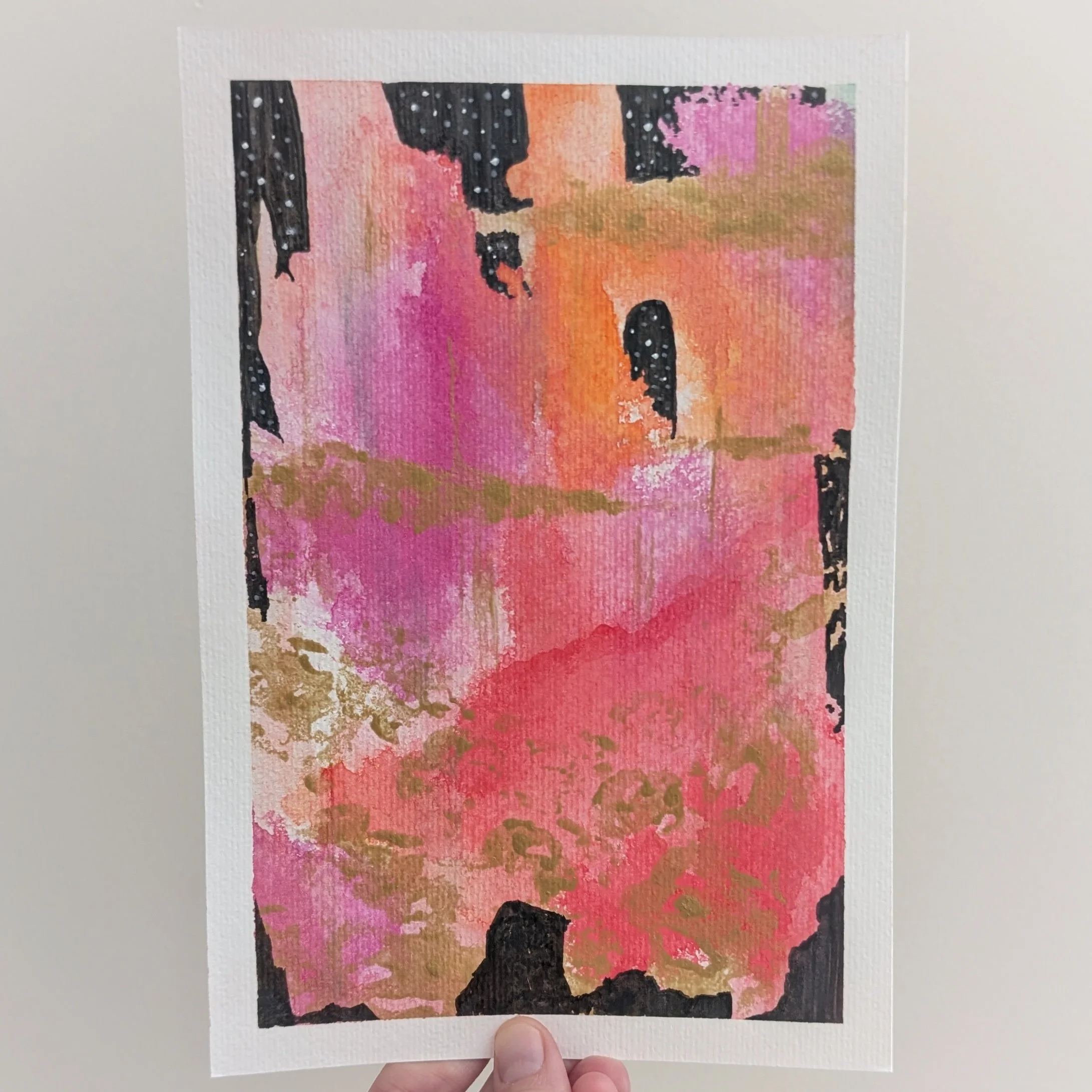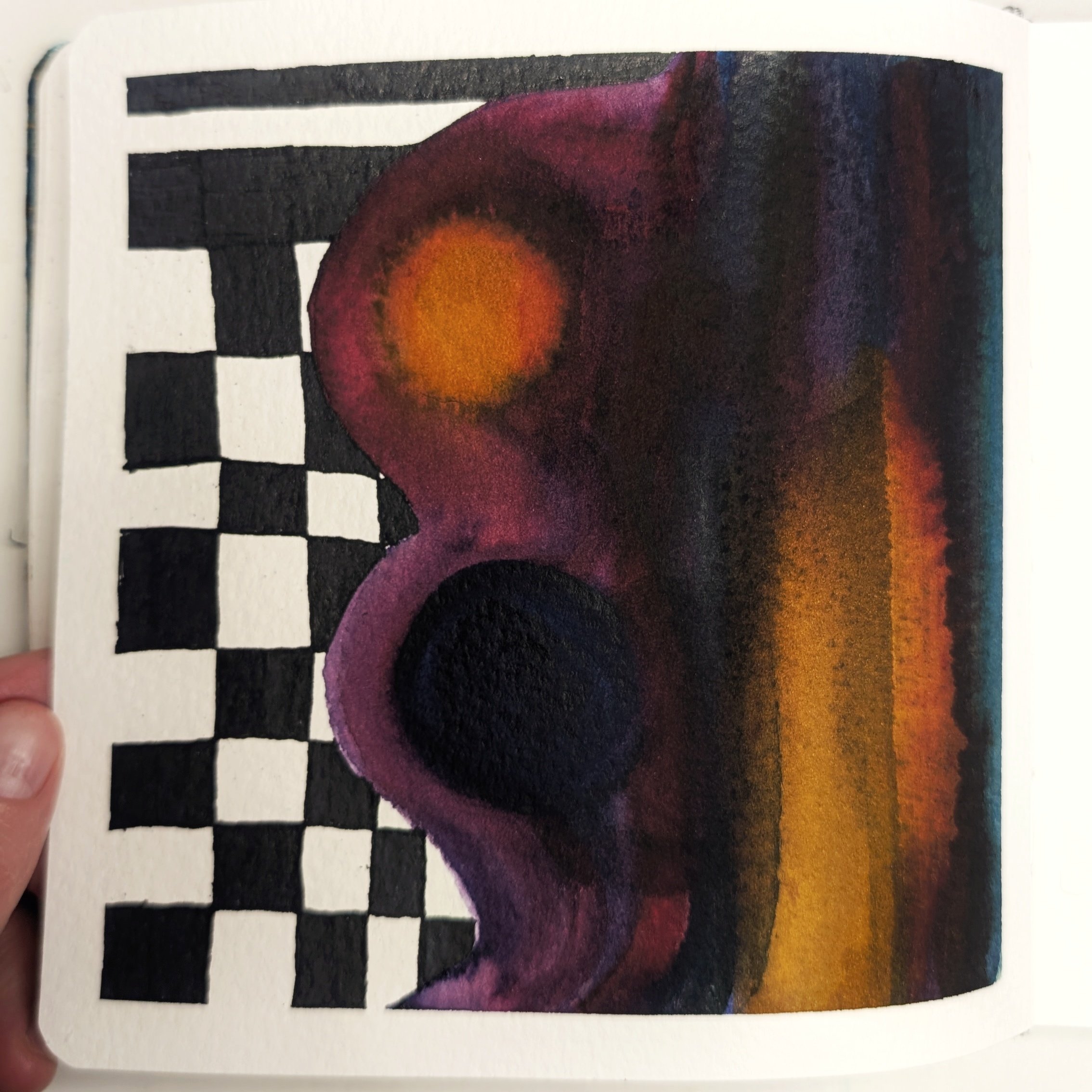 In contrast to its inspirational powers, music can also help solidify an existing mood. For example, a lot of times I've already been inspired by a particular color palette or set of shapes. I don't know where it comes from. Probably the primordial creative melting pot of my subconscious or, you know, a greeting card. Regardless, to help me hold onto that mood, I reach for music that fortifies the vibe. The photo below is a recent watercolor and acrylic piece I painted. I really wanted to use a dark, brooding palette with an assortment of abstract shapes. The German dark jazz band, Bohren & der Club of Gore matched the mood perfectly for this painting session, specifically the song "Constant Fear".