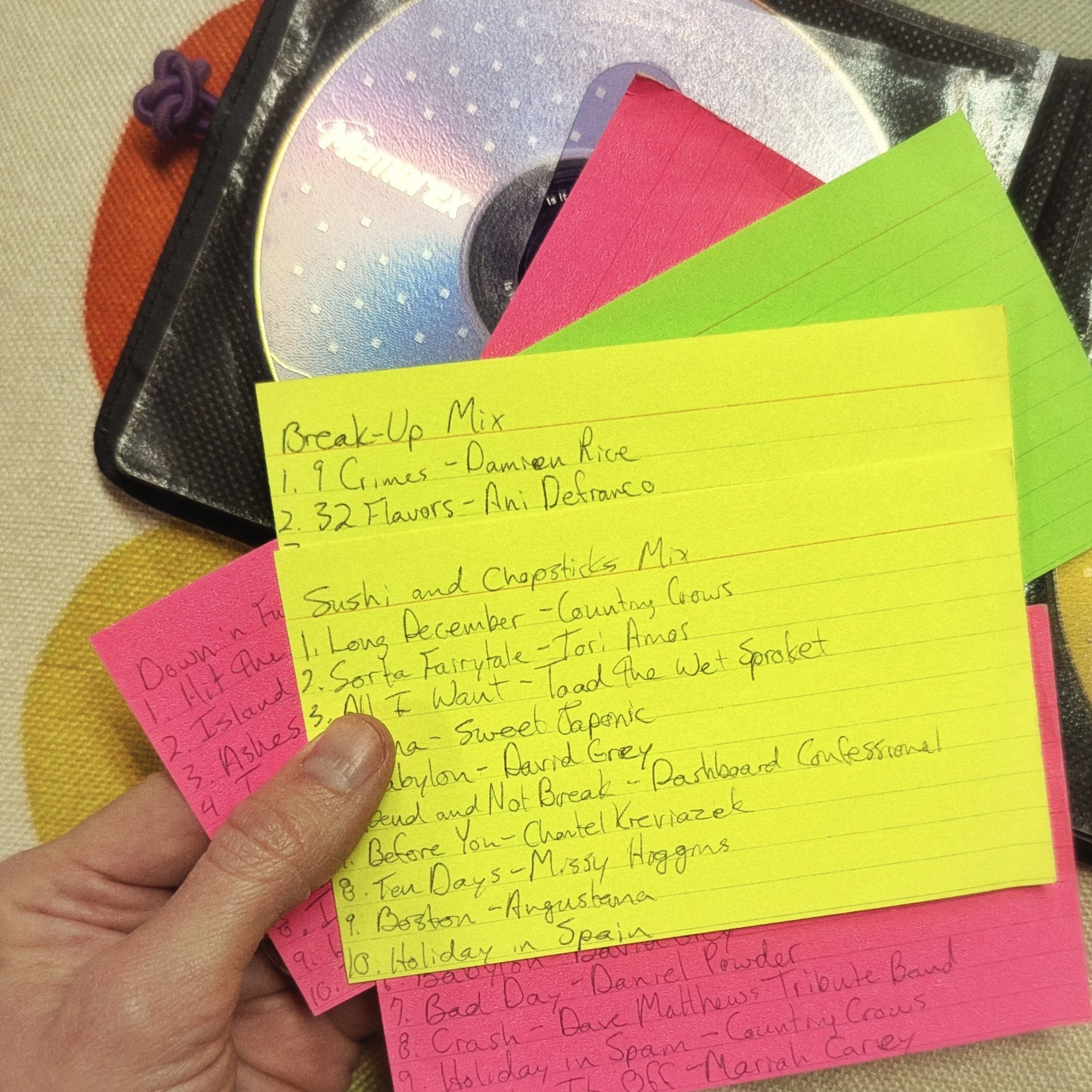 A smattering of early 2000s mixed CD playlists on stylish neon index cards. Proof that this obsession with sad songs has been ongoing for some time, not that you needed any.